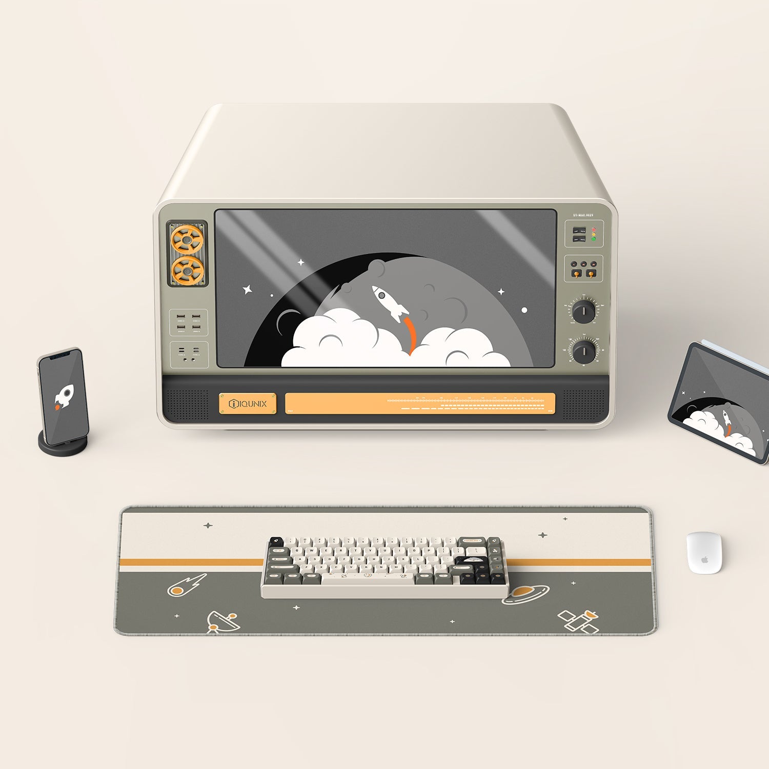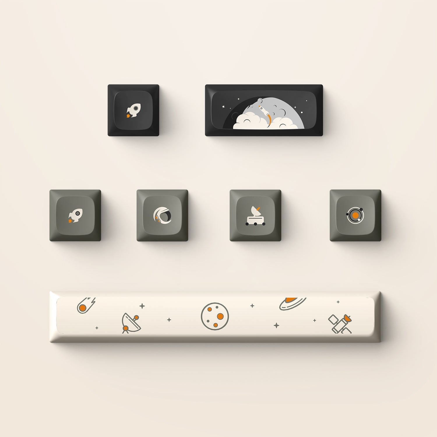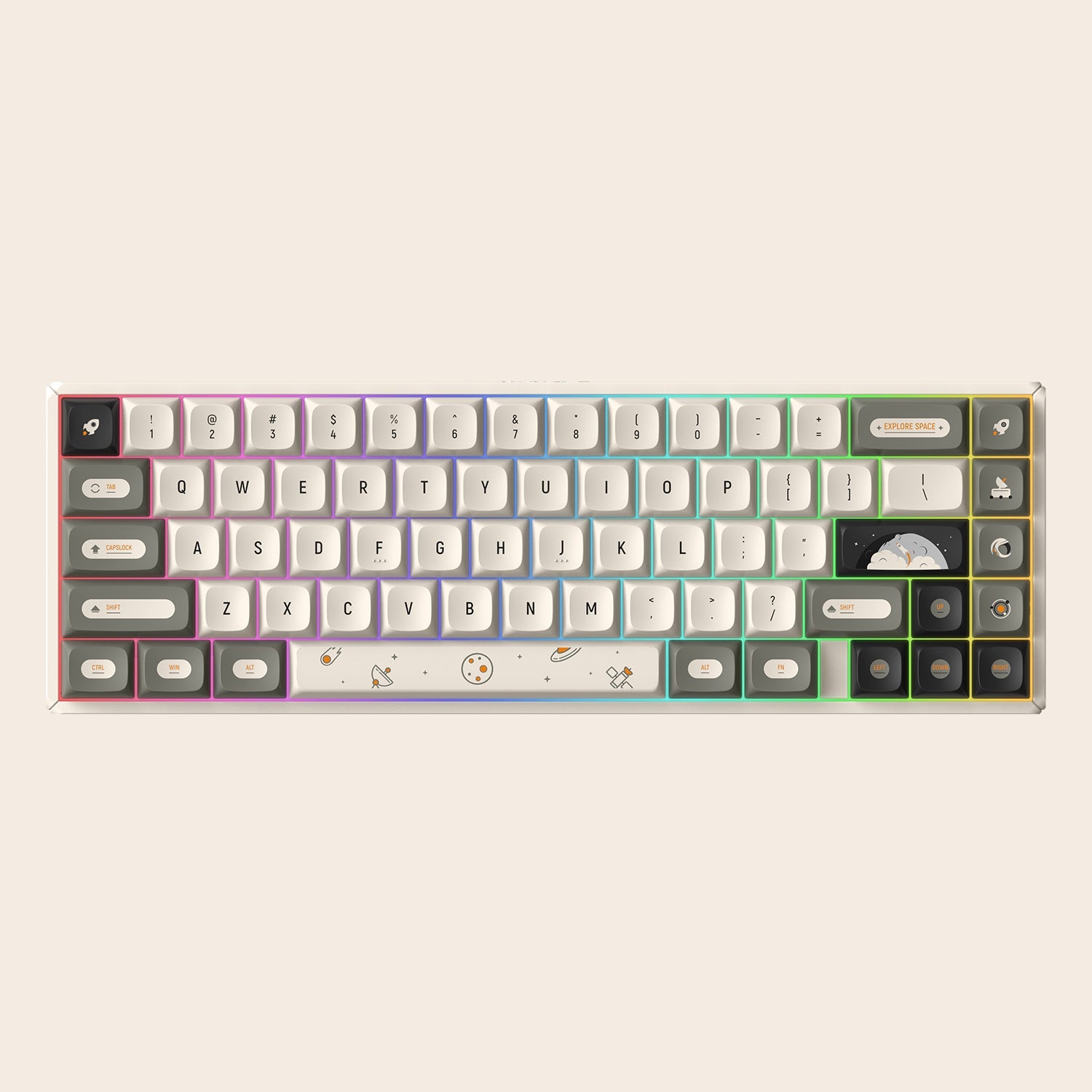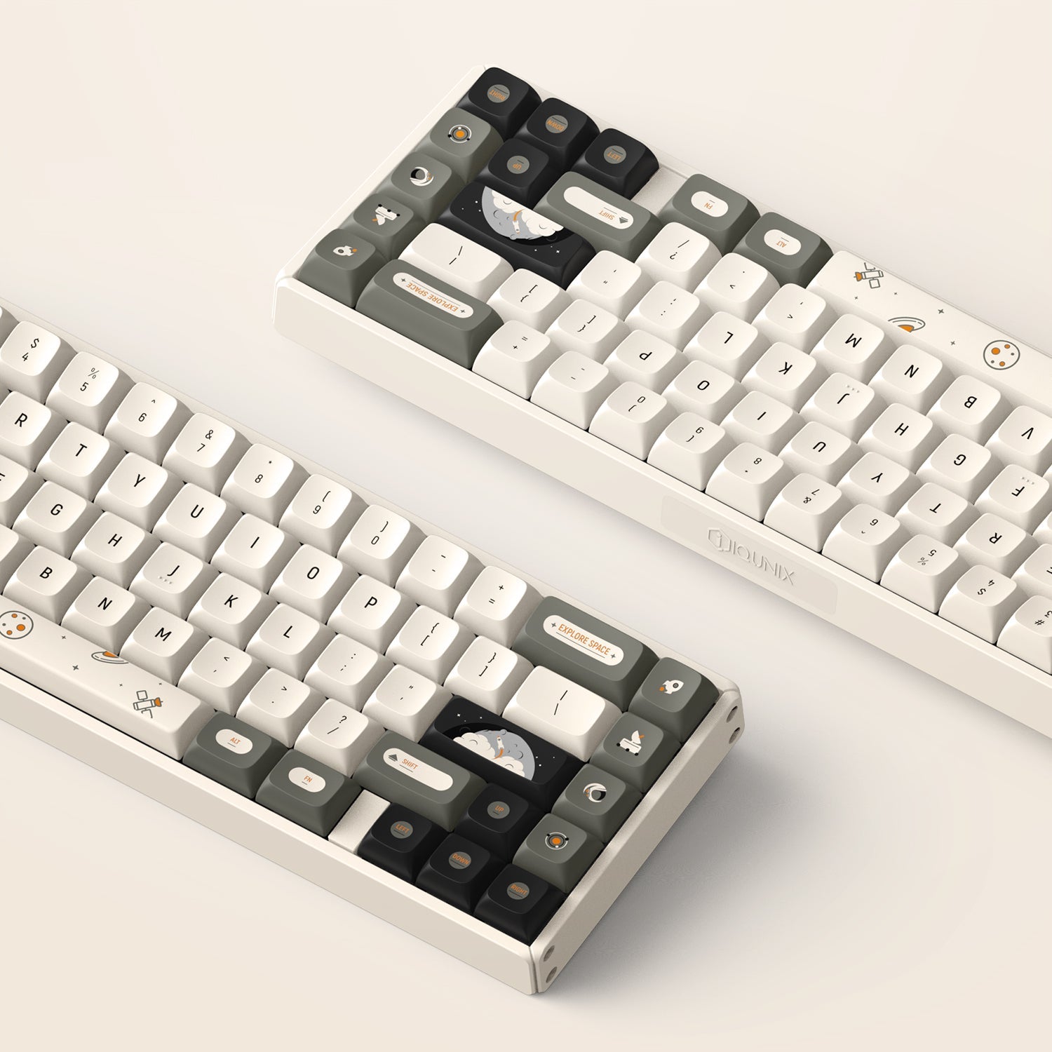 The IQUNIX F65 Hitchhiker wireless mechanical keyboard is inspired by the novel "The Hitchhiker's Guide to the Galaxy". The model has a gray and white color scheme with a space theme and novelty keycaps to it, which makes people immerse themselves in the world of space roaming, expressing that although life is full of absurdities, we should treat life with a non-panic, relaxed, and humorous attitude.