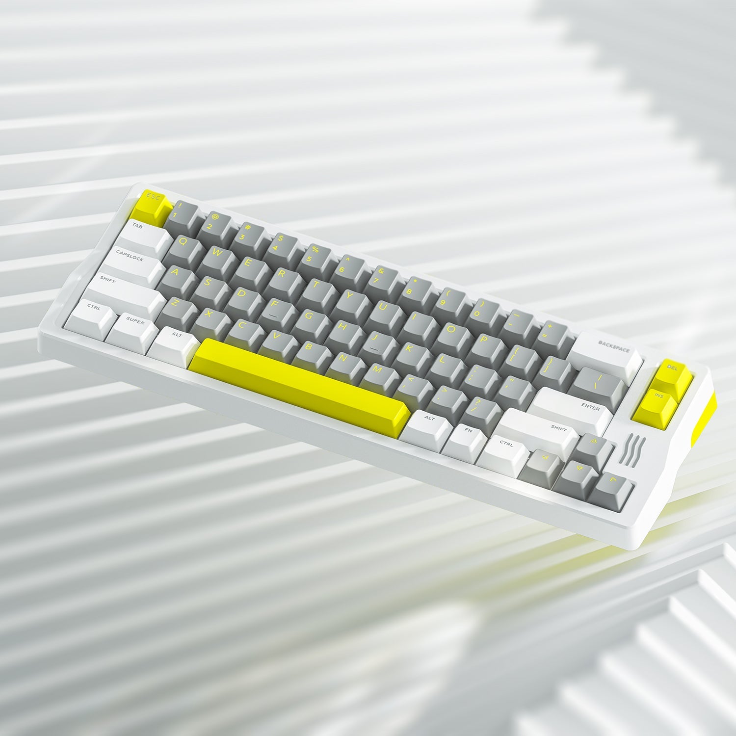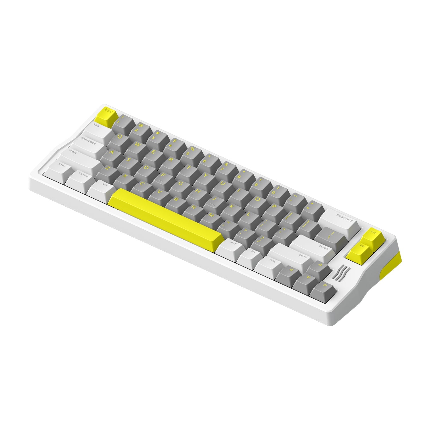 The IQUNIX Q66 Fluorescence keyboard has very nice soft grey keycaps with yellow legends, surrounded by some white keycaps with grey legends, and the four really vibrant neon yellow keycaps that really tie in with this Fluorescence theme, which add vitality to the grey and white frigid style.