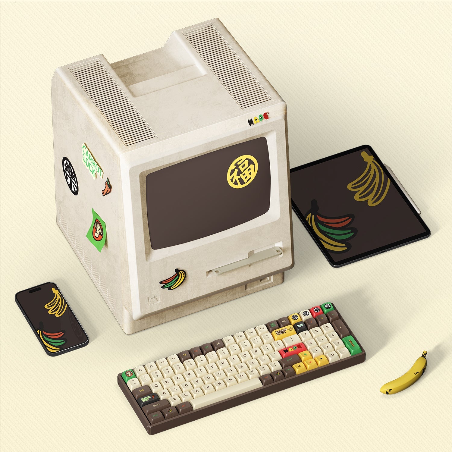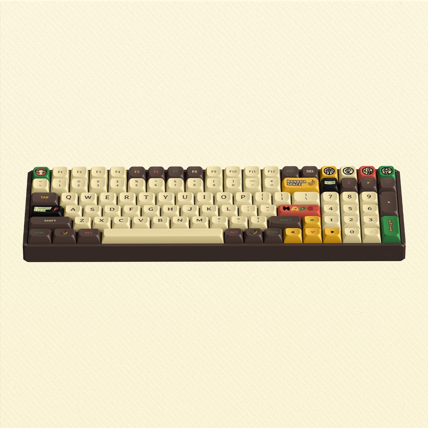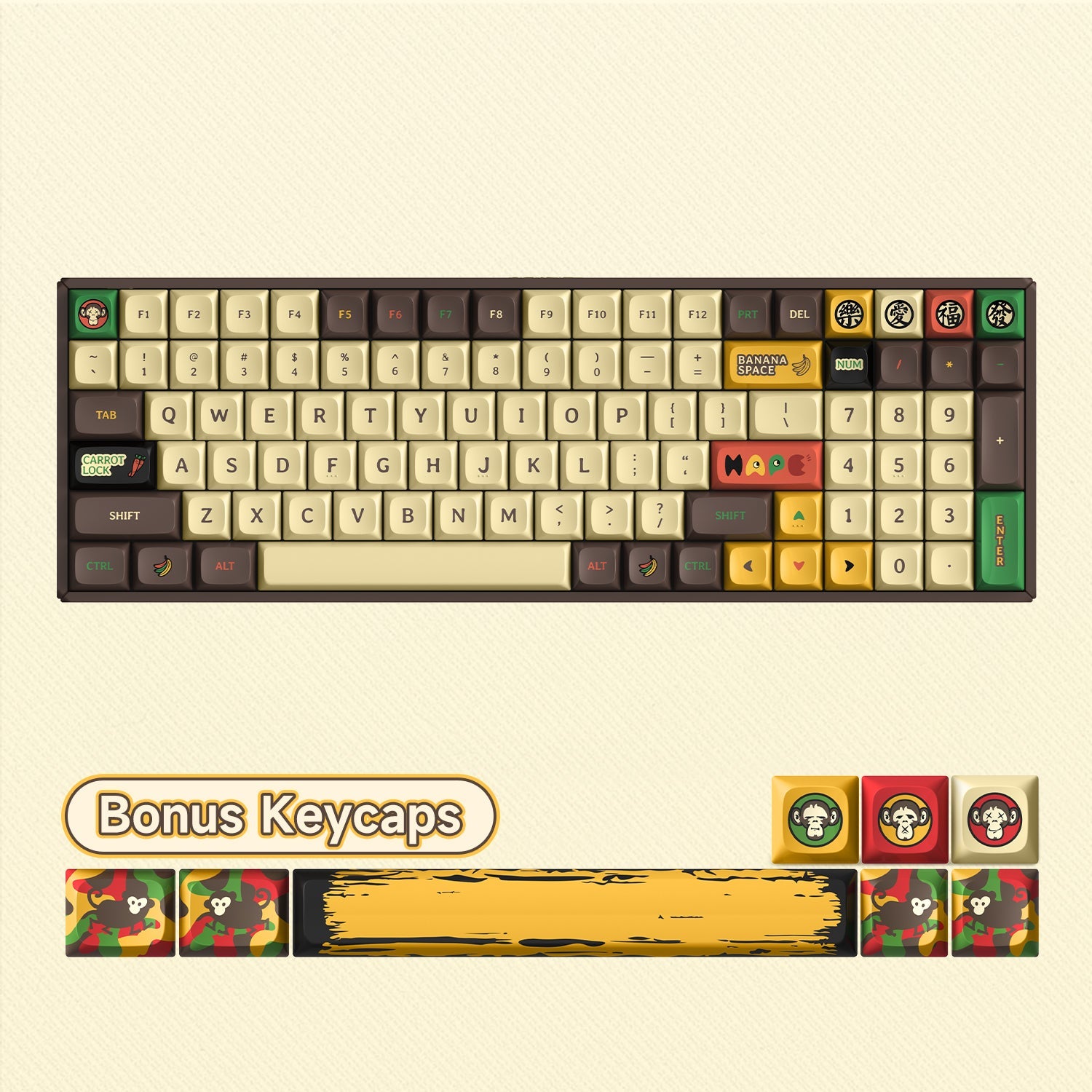 IQUNIX F97 Happy Ape-themed mechanical keyboard is inspired by the three wise monkeys who "don't listen, don't see, don't speak", which also matches the attitude of "Confucian Analects": see no evil, hear no evil, speak no evil. Also, the Chinese characters 樂(joy), 福(fortune), 愛(love), and 發(prosperity) are the best wishes for all. The cute happy apes and the yellow banana theme color scheme will take you into a happy ape theme park full of fun and whimsy!