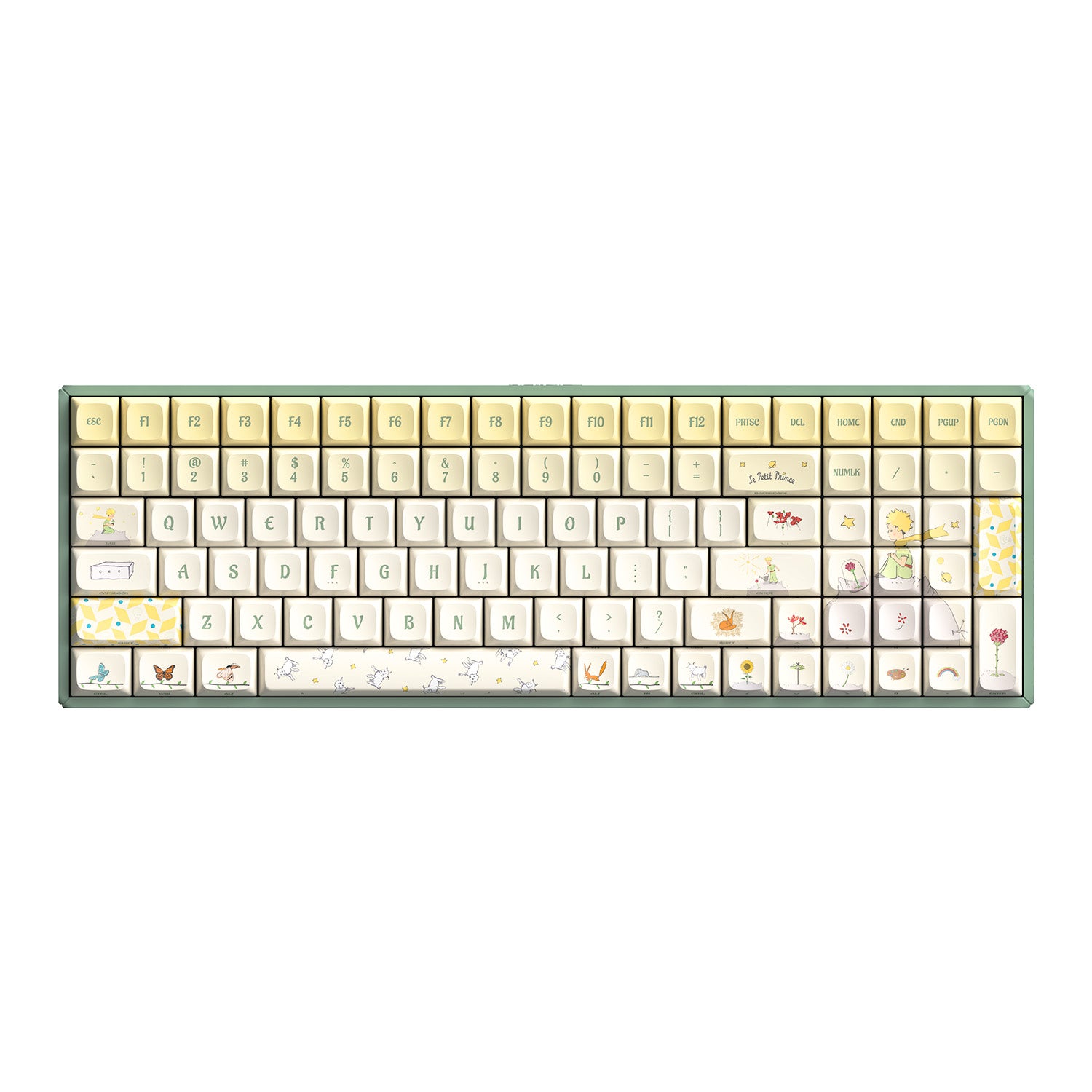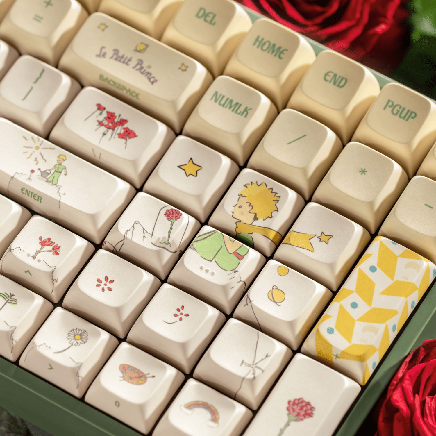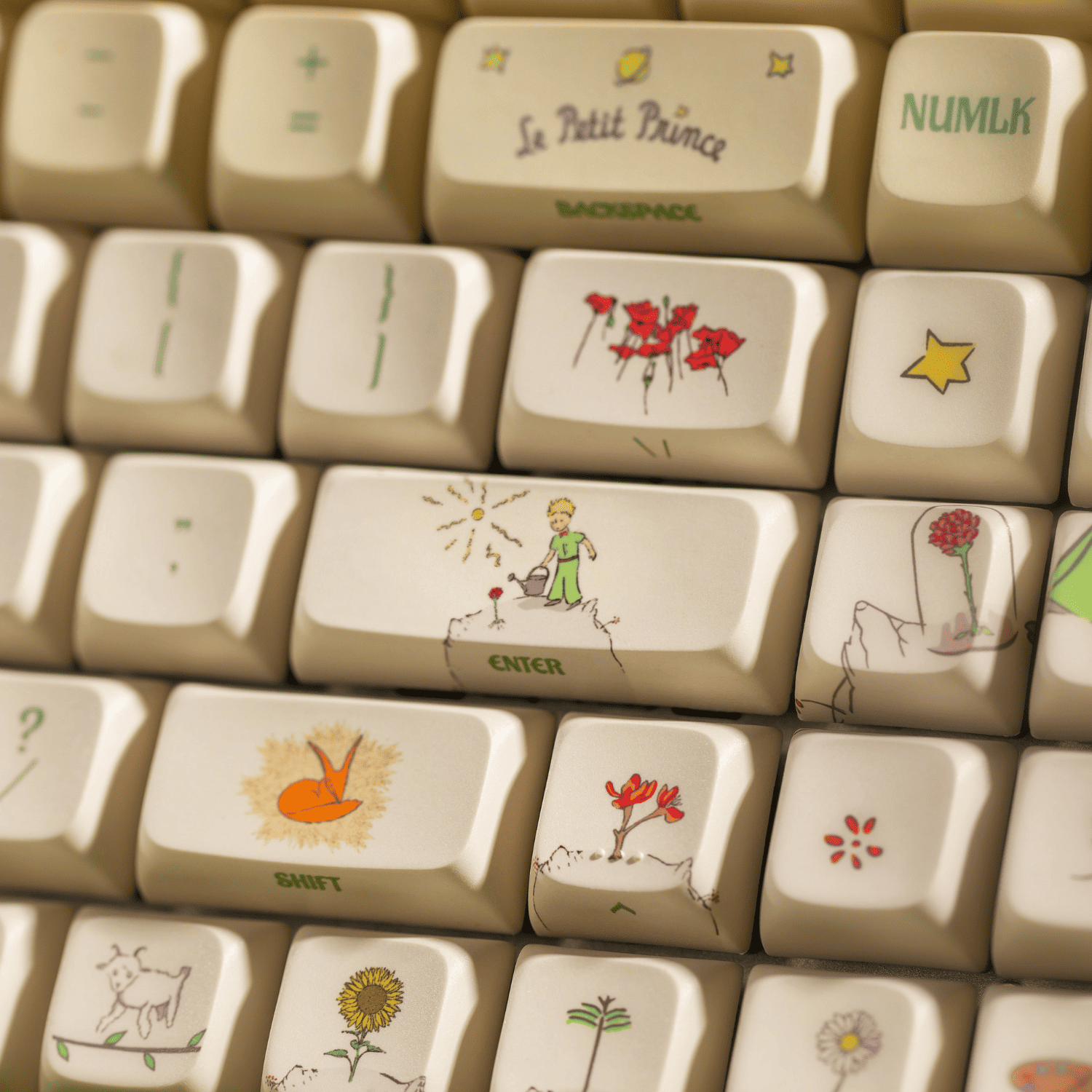 The overall design is natural and fresh, with yellow and milky white keycaps paired with light green characters, which are natural, comfortable, and full of pastoral atmosphere. In addition to the main key area, the surrounding keycaps are full of Little Prince elements, such as roses, foxes, planet B-612, lambs, etc. They are rich in details and full of sincerity.