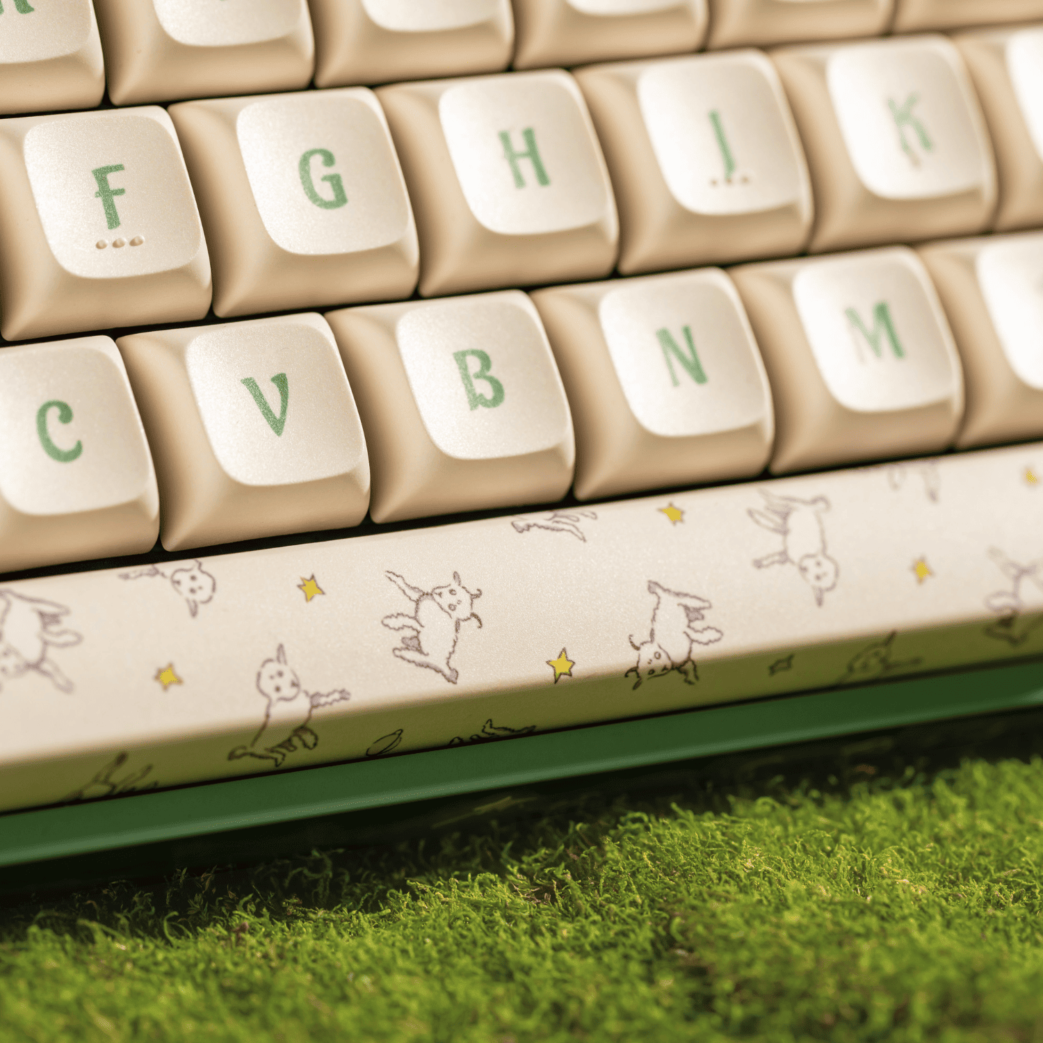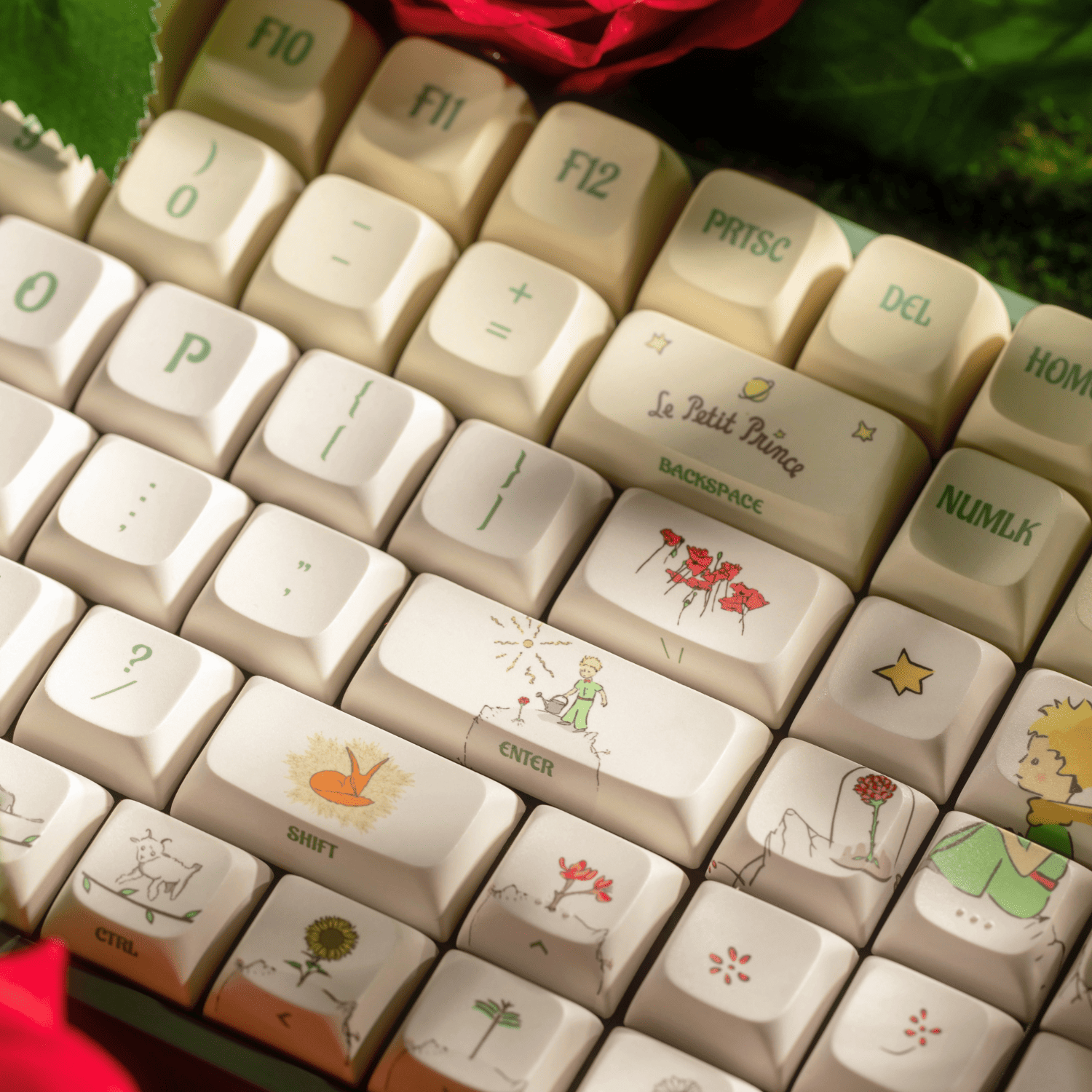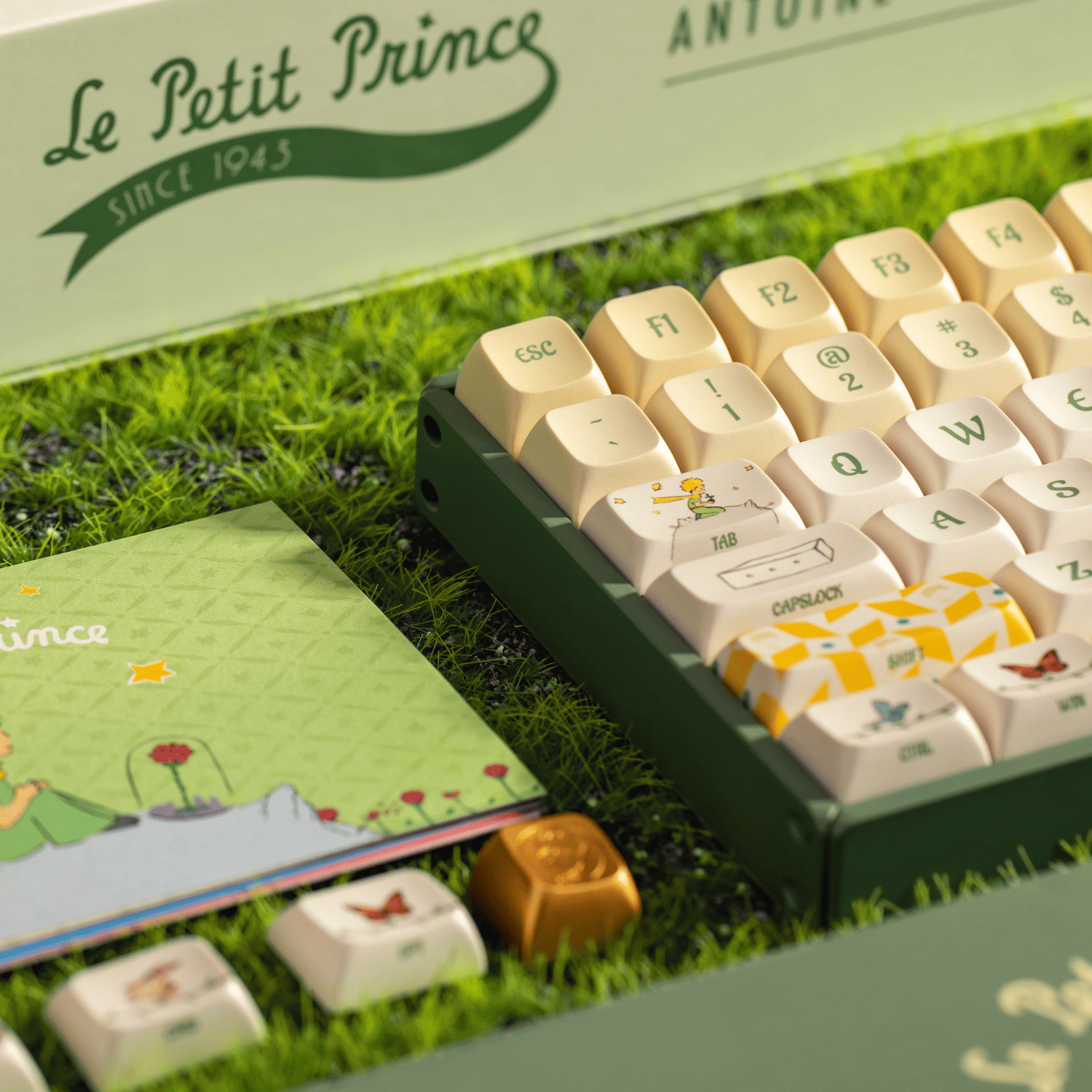 The overall design is natural and fresh, with yellow and milky white keycaps paired with light green characters, which are natural, comfortable, and full of pastoral atmosphere. In addition to the main key area, the surrounding keycaps are full of Little Prince elements, such as roses, foxes, planet B-612, lambs, etc. They are rich in details and full of sincerity.