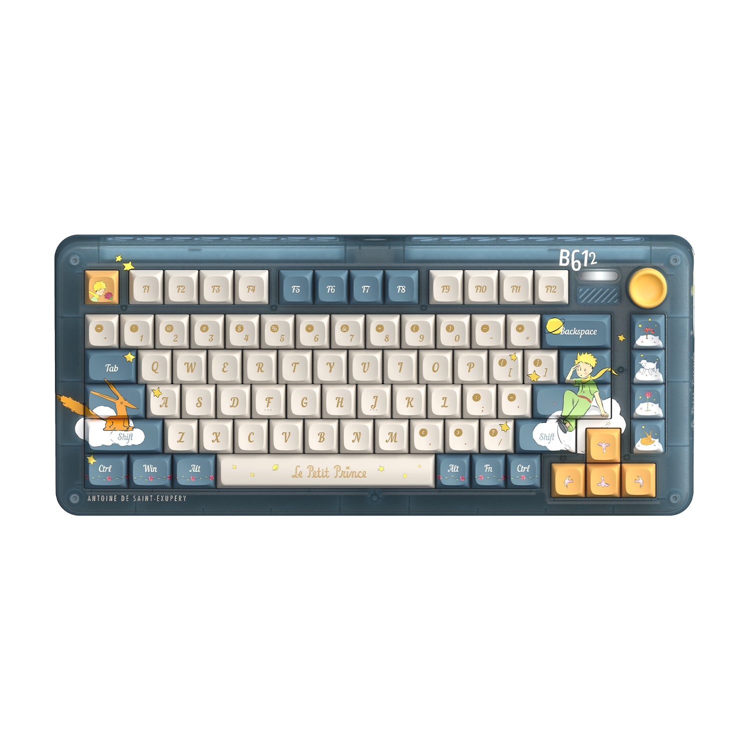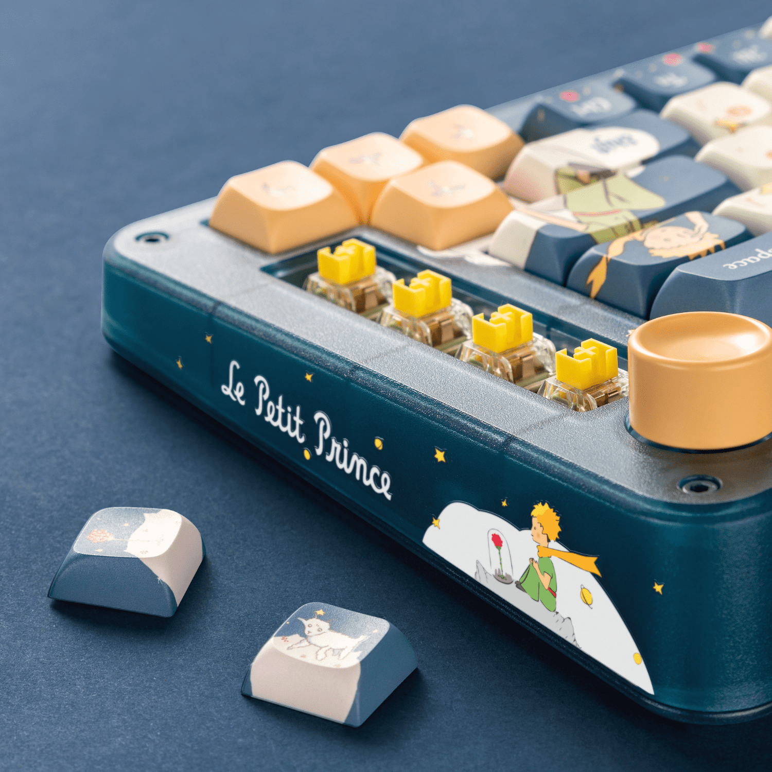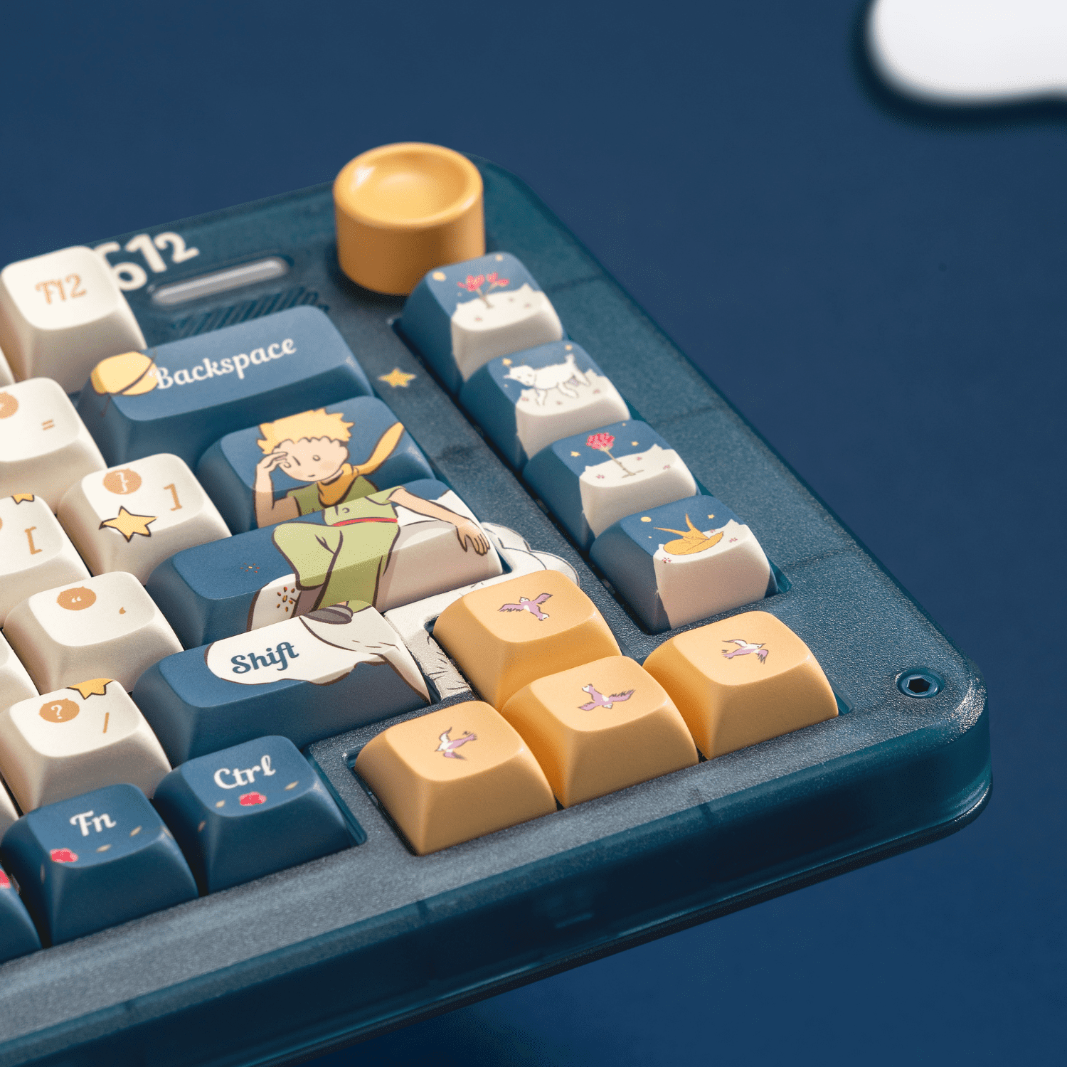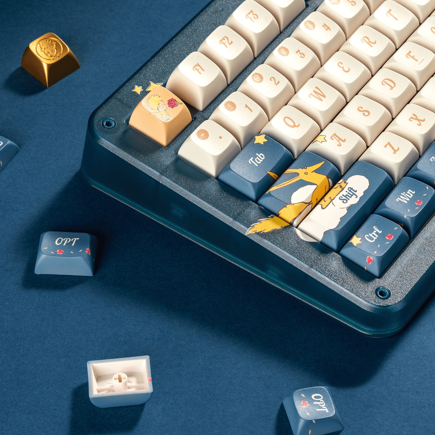 ZX75 Sky Encounter's keycaps use PBT with dye sublimation for a delicate touch, while the illustrations and artistic fonts vividly depict Little Prince's journey. Mac supplementary keycaps are included in the packages.