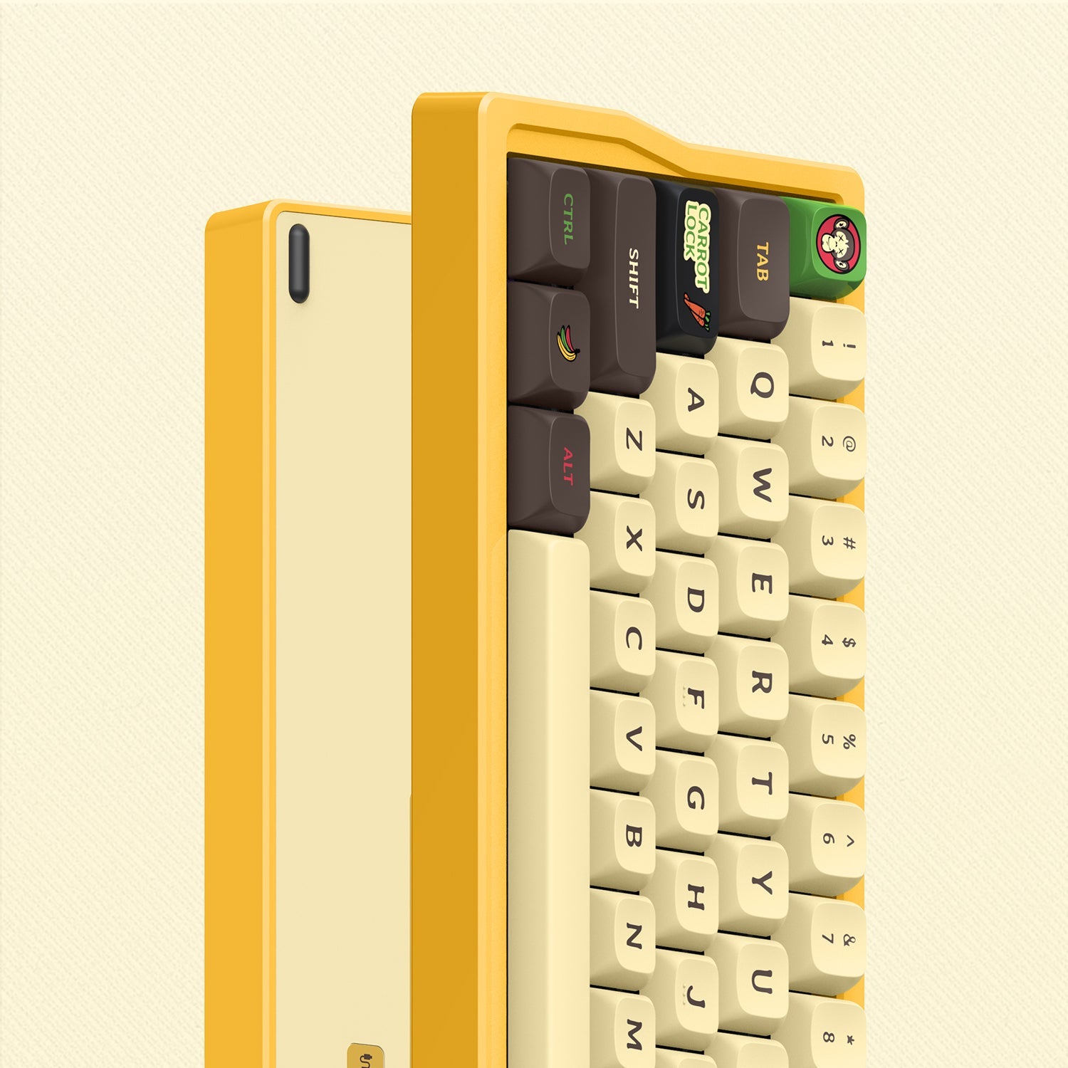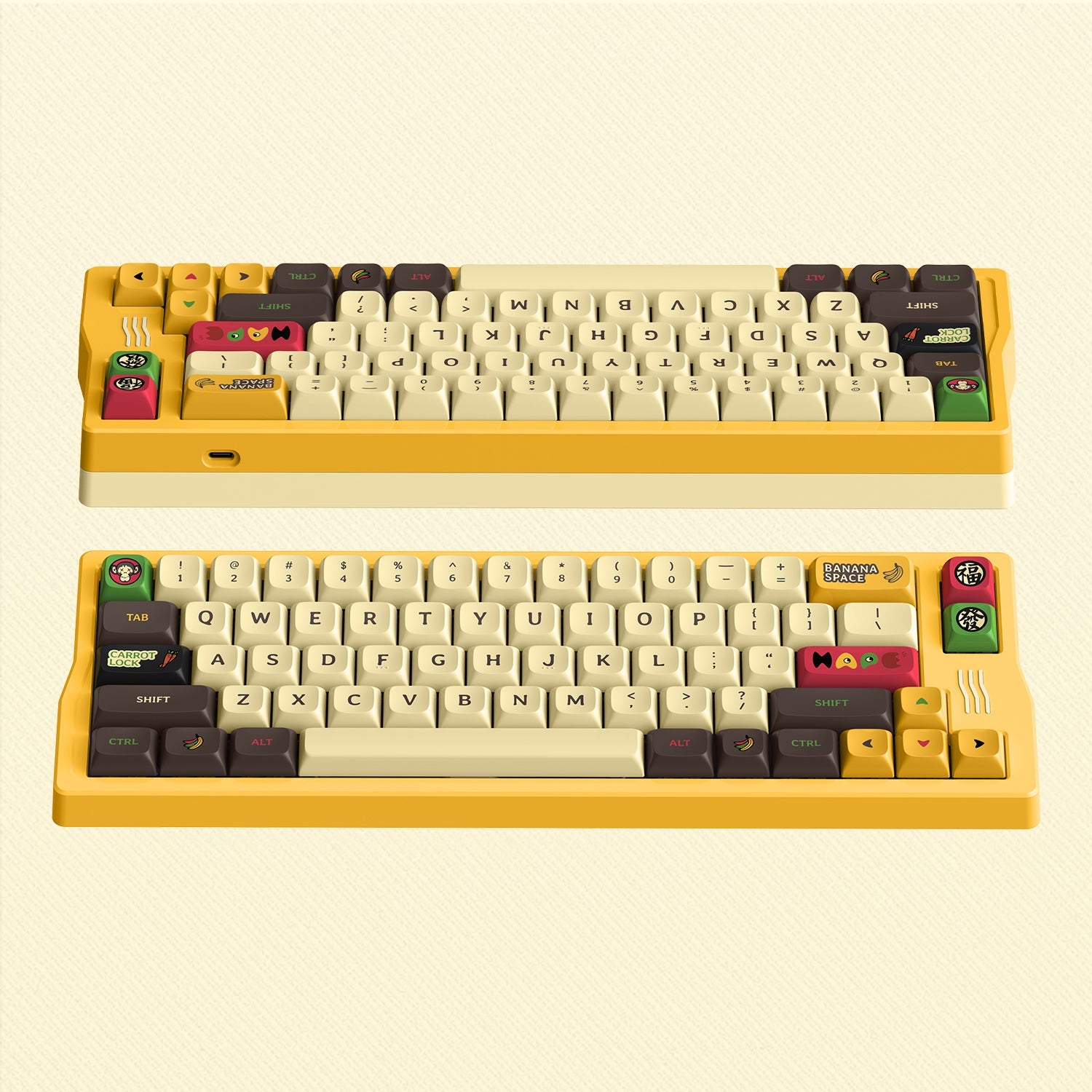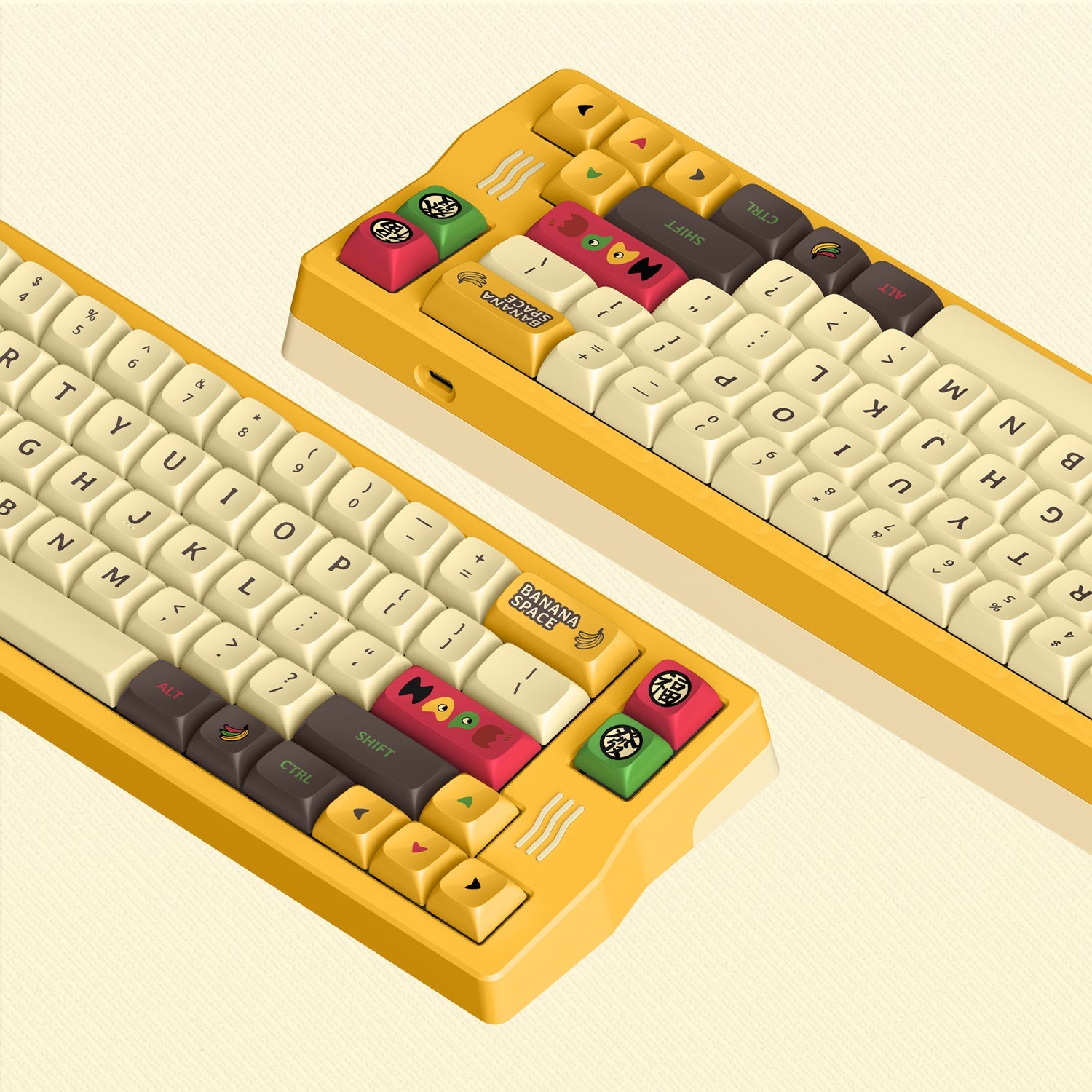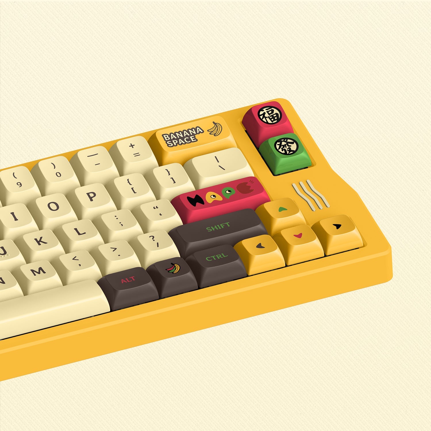 IQUNIX Q66 Happy Ape-themed mechanical keyboard is inspired by the three wise monkeys who "don't listen, don't see, don't speak", which also matches the attitude of "Confucian Analects": see no evil, hear no evil, speak no evil. Also, the Chinese characters 樂(joy), 福(fortune), 愛(love), and 發(prosperity) are the best wishes for all. The cute happy apes and the yellow banana theme color scheme will take you into a happy ape theme park full of fun and whimsy!