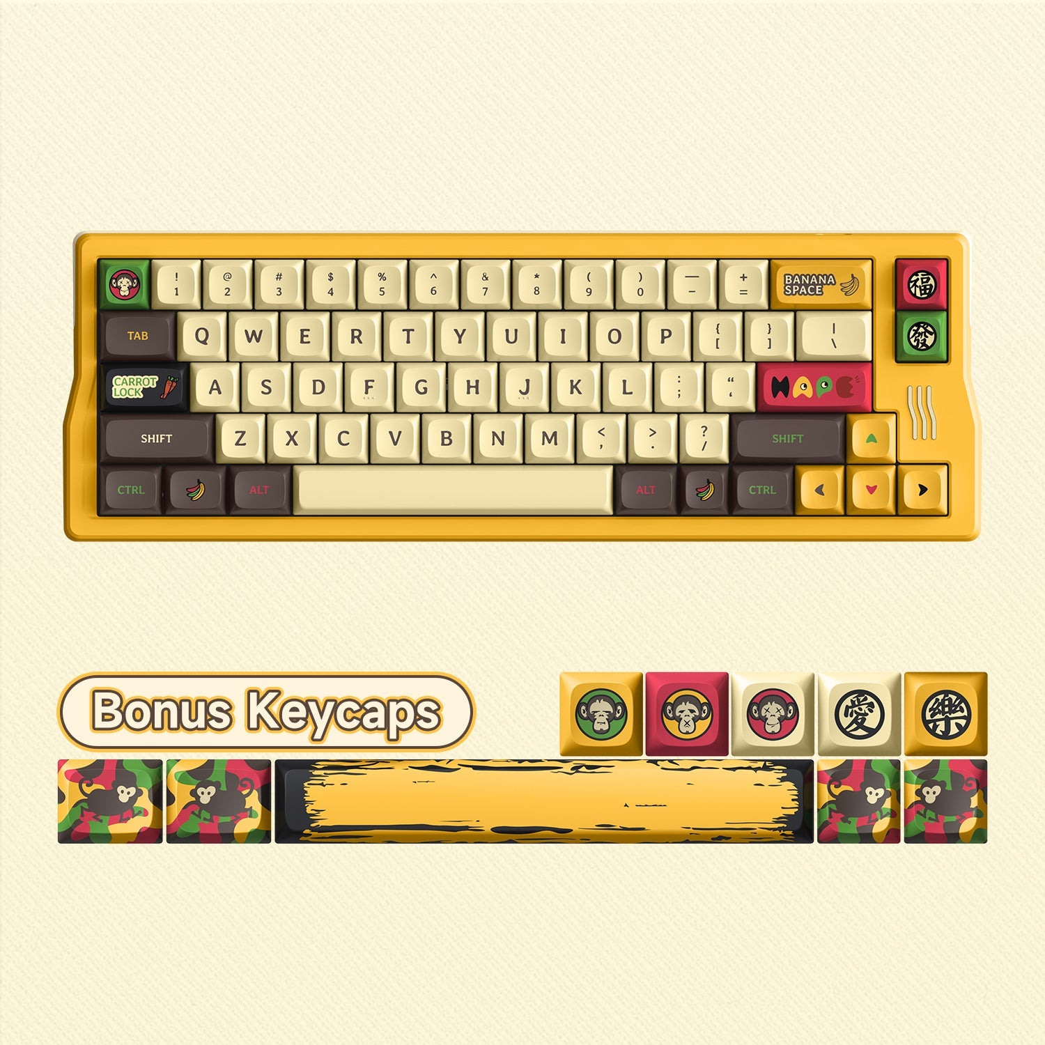 The unique legends with an enjoyable textured PBT surface and KDA profile, make these keycaps look and feel great and also enhance your typing experience for years to come. The bonus keycaps come with the iconic 3 wise monkeys, 2 Chinese characters 樂(joy) and 愛(love), 4 normal monkeys, and the alternative banana spacebars, which greatly spice up your keyboard!